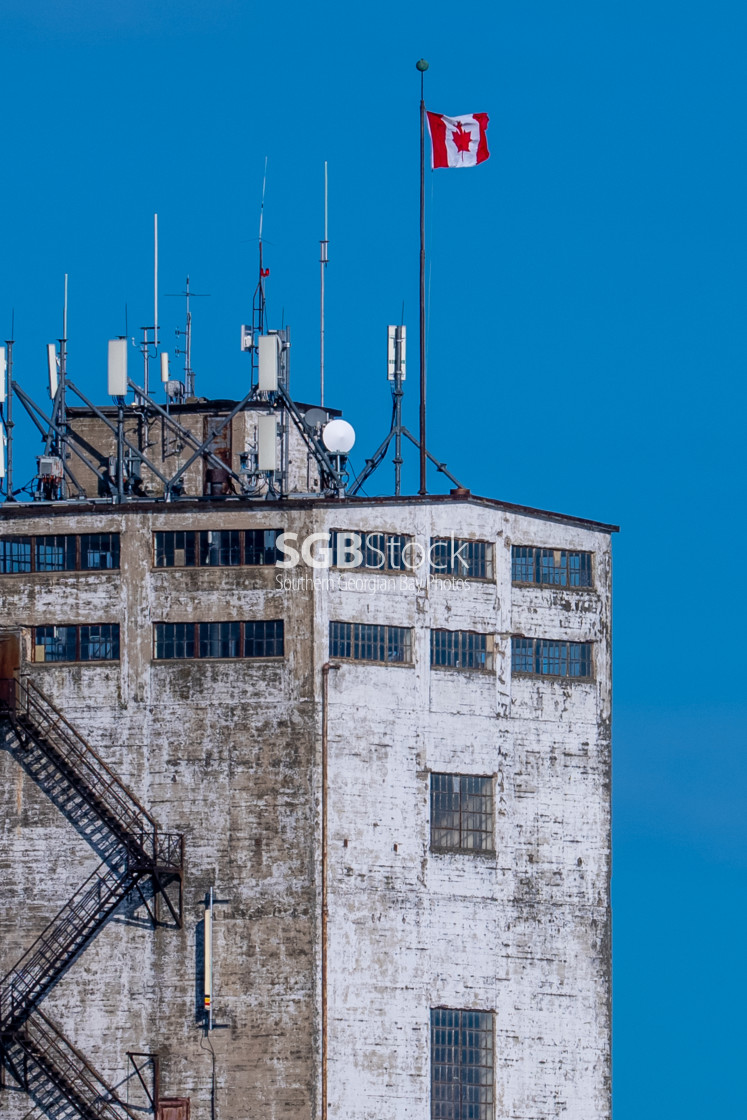 The top of the Collingwood terminals building with the Canadian flag.